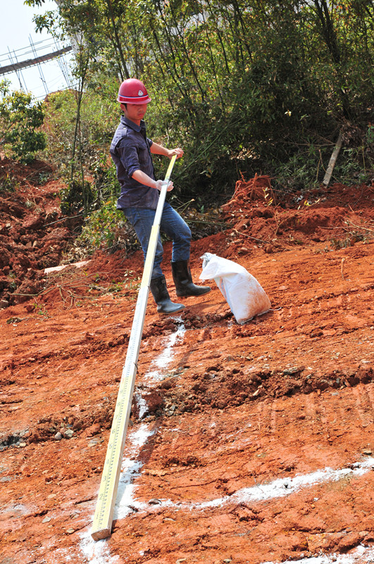 胡明同志在共青項(xiàng)目主動(dòng)學(xué)習(xí)測(cè)量放線業(yè)務(wù)知識(shí)