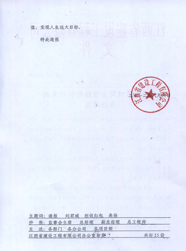 關于劉君誠同志拒收紅包的表揚通報